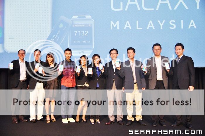 Ambassadors & Dato Lee Chong Wei & Pandelela Rinong holding up the Galaxy S5 and Galaxy Gears up